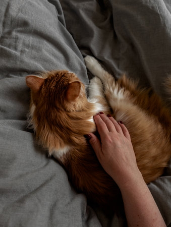 A woman's hand strokes a beautiful red cat sleeping next to her on the gray bed linen
