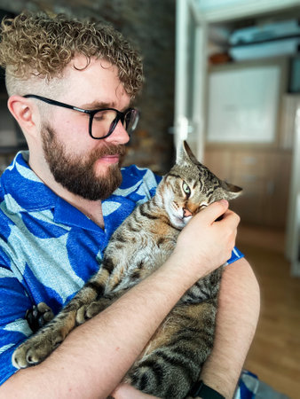 Warm moment between a millennial man and his cat, bond and affection shared in a cozy home environment. Portrait at home. Pet and friendship concept