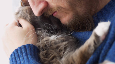 A bearded man lovingly hugs his cat, hugs him to himself. Favorite cat with his owner. Relationship between pets and people. Gray fluffy cat in the arms of his pet owner.