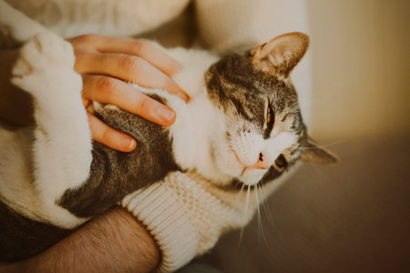 Hand of a man caress his beautiful tabby cat at home