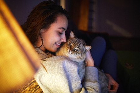 young woman with striped cat at evening sits on sofa in dark room with the table lamp. Woman smiling and stroking a cat. Tenderness and care for your pet. pets, evening, comfort, rest and people concept