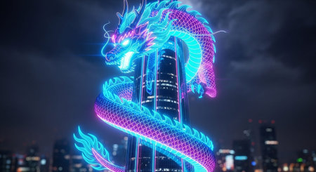 Vector illustration of a dragon on a dark background. Colorful fire dragon.