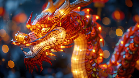 Close-up of a beautifully illuminated dragon lantern, showing intricate details and warm, inviting glow. A symbol of celebration and good fortune.