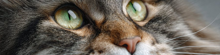 Adult serious brown cat with green eyes looking at the camera. Banner panorama. Free space for text