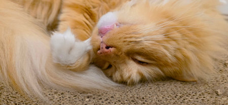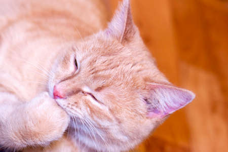 Ginger cat licks the hair of the paw
