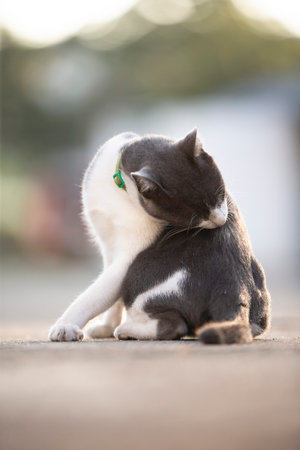 A cute cat licking itself while lying outdoors