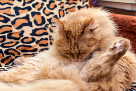 Fluffy red cat washes at home on the sofa.