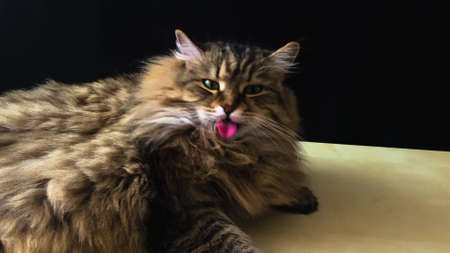 A domestic cat of the Siberian breed lies on a wooden table and licks its fur with its tongue, washes its muzzle