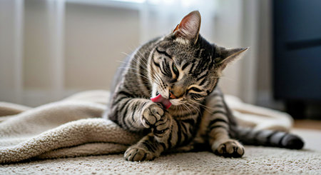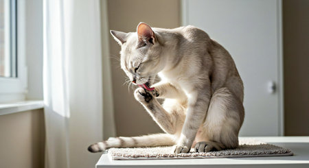 Close-up of a fluffy domestic cat grooming itself, licking its paw with tongue visible. Clean minimalist background, concept of hygiene, self-care, pets, and animal behavior.