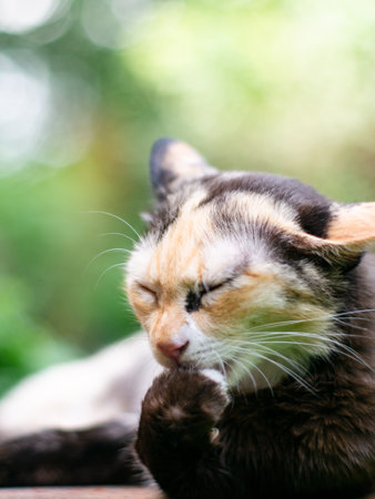 The blend of white, black, and orange colors enhances its graceful appearance. The scene captures a moment of feline care and relaxation. A calico cat delicately grooms its fur with precision.