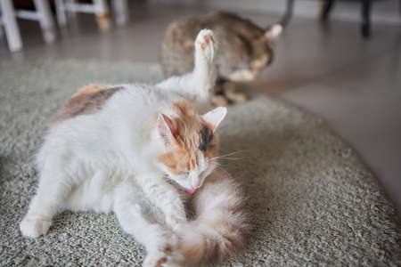 Neat cat and cat licking his paw showing tongue