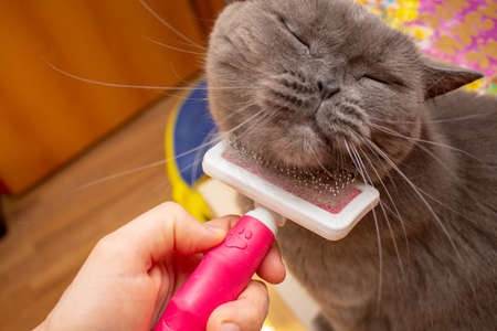 Grooming brushing gray pretty cute cat with a special brush for grooming pets care concept