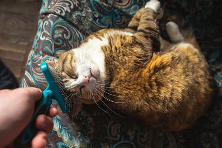 Domestic cat in relaxing mood. Human friendly hand spoil his cat with a special pet brush.