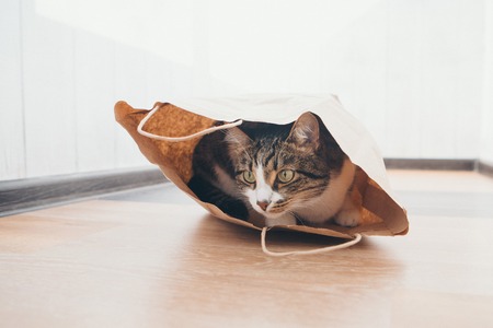 A paper bag from a supermarket at home on the floor, into which a gray cat climbed and ate all the products brought from the store. Funny cat sits in a paper bag and looks in different directions.