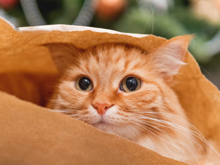 Cute ginger cat is hiding in craft paper bag. Fluffy pet in wrapping paper under the Christmas tree. Cozy home with decorations for New Year celebration.