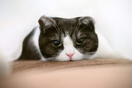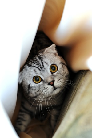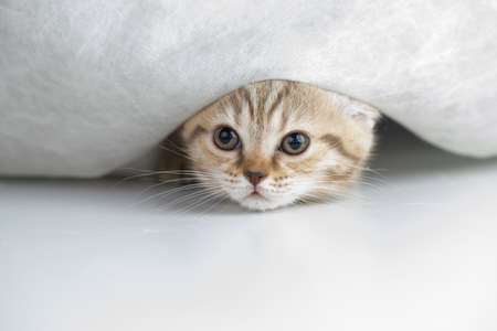 Cat hiding behind a white curtain in the interior. Scottish Fold