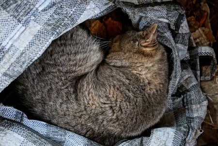 gray cat sleeping in the open big bag