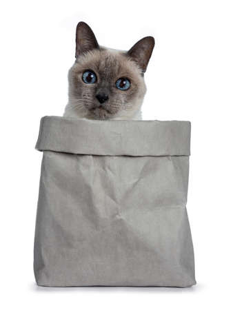 Senior blue Thai cat point sitting in gray bag, looking over edge with blue eyes straight into camera. Isolated on white background.
