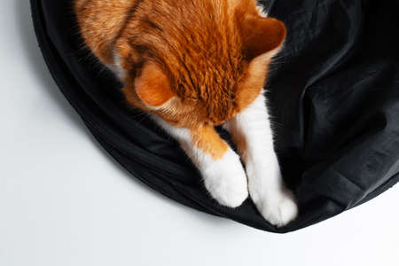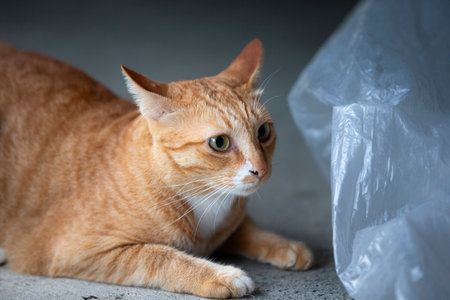 Orange cat in plastic bag on the floor. Close-up.