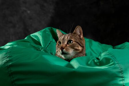 Portrait of a disgruntled domestic tabby cat lying under a warm wool blanket in the cold season. A pet.