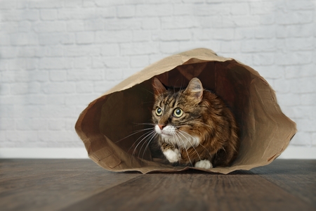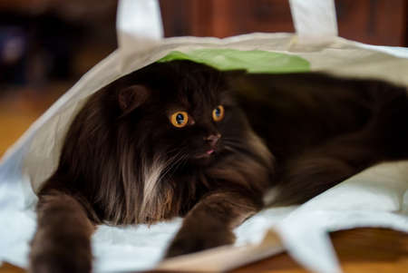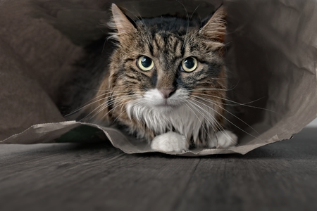 cute brown furry siberian cat with yellow eyes looking out of a paper bag to the right