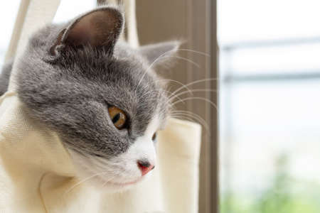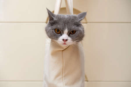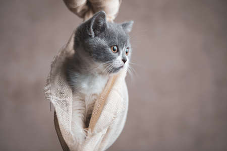 young british shorthair cat looking away with a deep look and hanging in a cloth on gray background