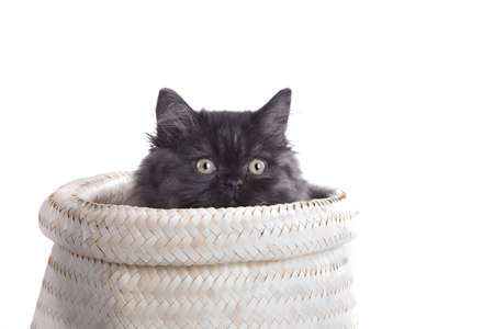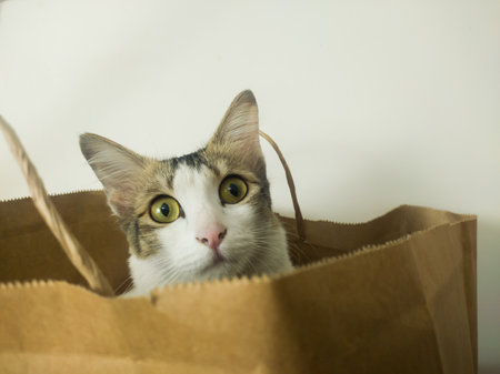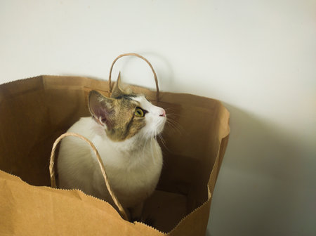white kitten cat peeping out of brown bag. shot in white background.