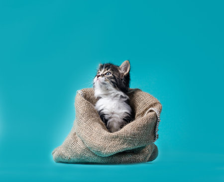 tabby kitten gets out of the sack on a turquoise background