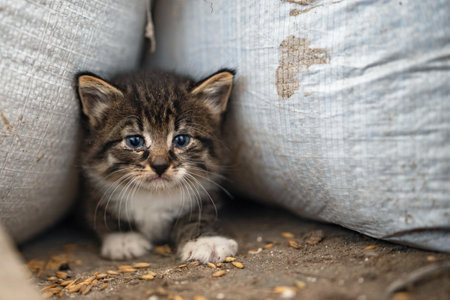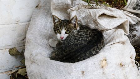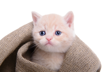 Cute little kitten with blue eyes sitting in a burlap sack