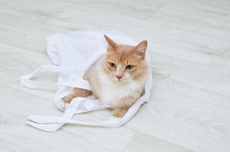 Zero waste concept. Beige cat on the floor of the room in a white cotton bag close-up.