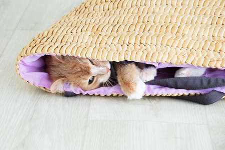 Panoramic banner portrait of red-white cat looking away, lying on the floor in eco paper bag. Close-up view.