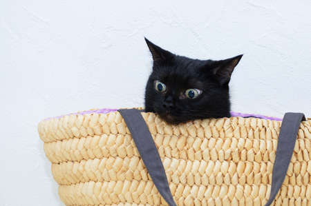 Close-up black cat sitting in a yellow wicker basket.