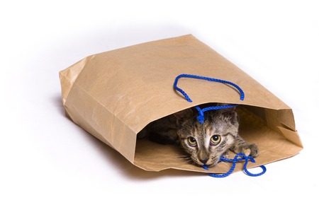tabby kitten in a paper gift bag