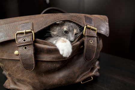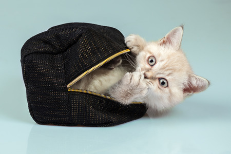 Cute little cat climbed into a leather briefcase and playfully peeks out of it, sticking out its paw, against a blurred background.