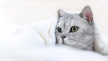Relaxed Scottish cat wrapped in white blanket muzzle close up. Where: Unspecified location. Comfortable setting. Conveying cats relaxation in cozy blanket.