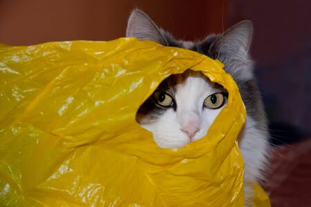 Cat in a yellow plastic bag looking through the hole, ecology concept