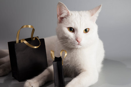 White cat sits with black bags with black friday sale
