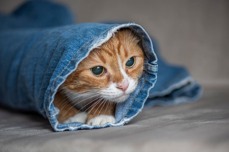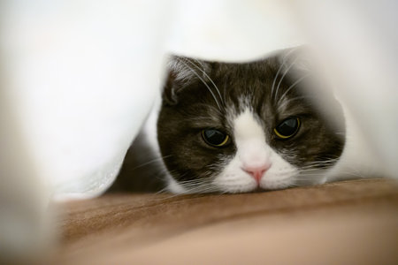 Cute cat hiding under a blanket. Selective focus on the eyes.