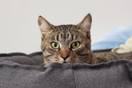 Cute tabby cat lying on bed at home. Adorable pet