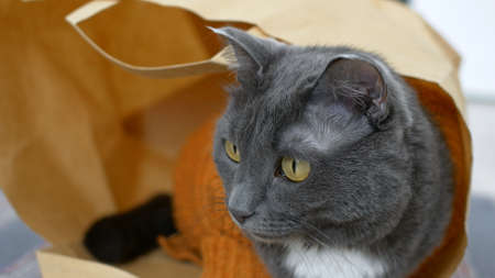 A cute gray cat is sitting in a paper bag, the cat is wearing a pet suit in the form of a brown sweater. A homeless cat lives in a bag, hiding from the cold in rags and paper so as not to freeze.