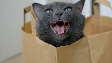 A cute gray cat sits in a paper bag from the supermarket, climbed into the bag and meows showing her white fangs. A cat with bright yellow eyes looks around and into the camera.