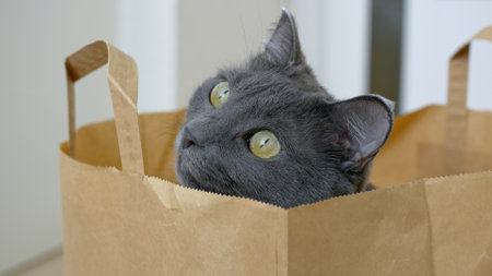 a cute british shorthair cat hiding inside a shopping bag at horizontal composition