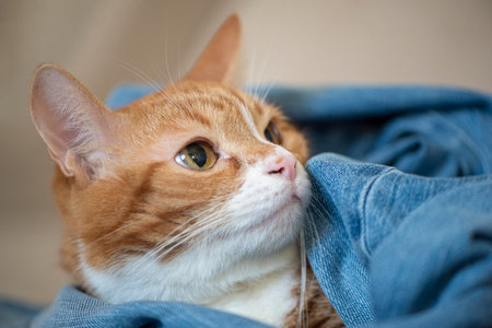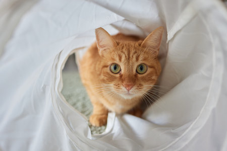 Cute cat peeking out from under a blanket. Shallow depth of field.