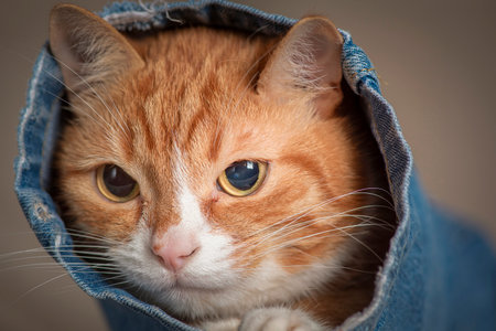 Adult nice red cat in bag like surprise