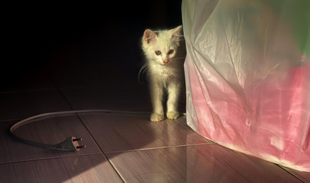 a photography of a white kitten standing in front of a pink curtain.
