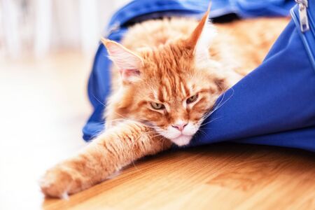 Red maine coon cat sitting in a suitcase. Traveling with pets concept.
