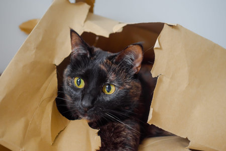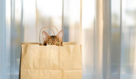 Funny cat with big yellow eyes looks out of curiosity from a craft paper bag. Funny pets playing at home. Cat sits in a paper bag.