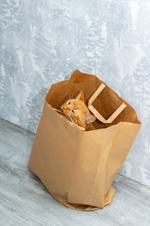A cute red cat looks out of a paper bag. Copy space.