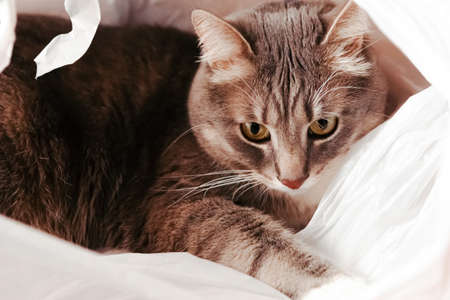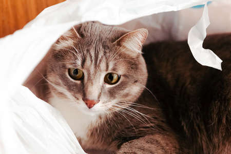 Beautiful gray tabby cat is inside a plastic bag and looking away, close up