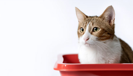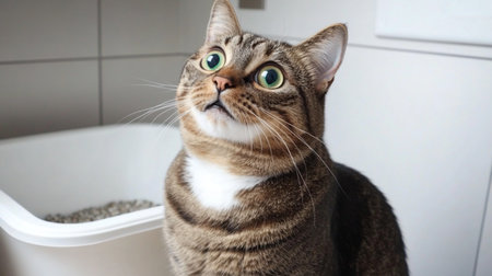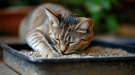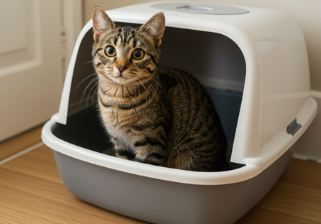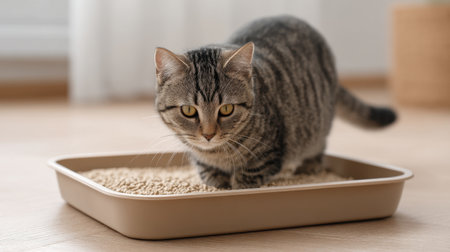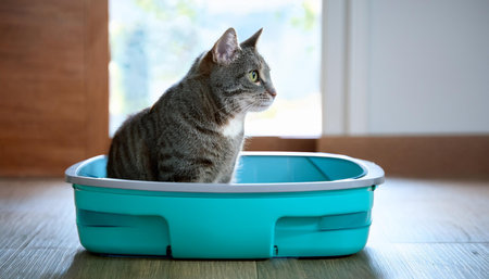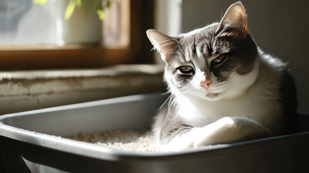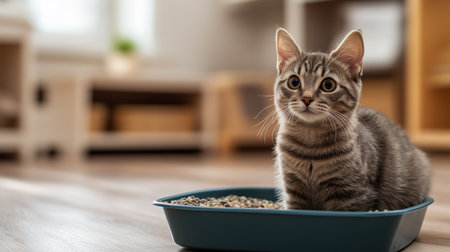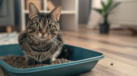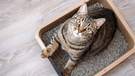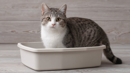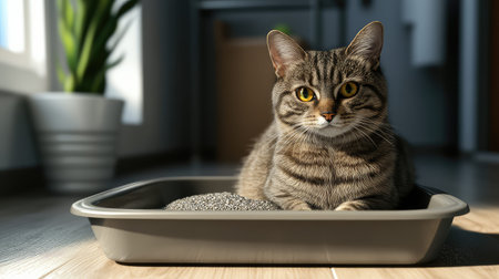 Domestic tabby cat comfortably sitting inside a litter tray, captured in a clean, well-lit indoor setting ideal for pet lifestyle themes.